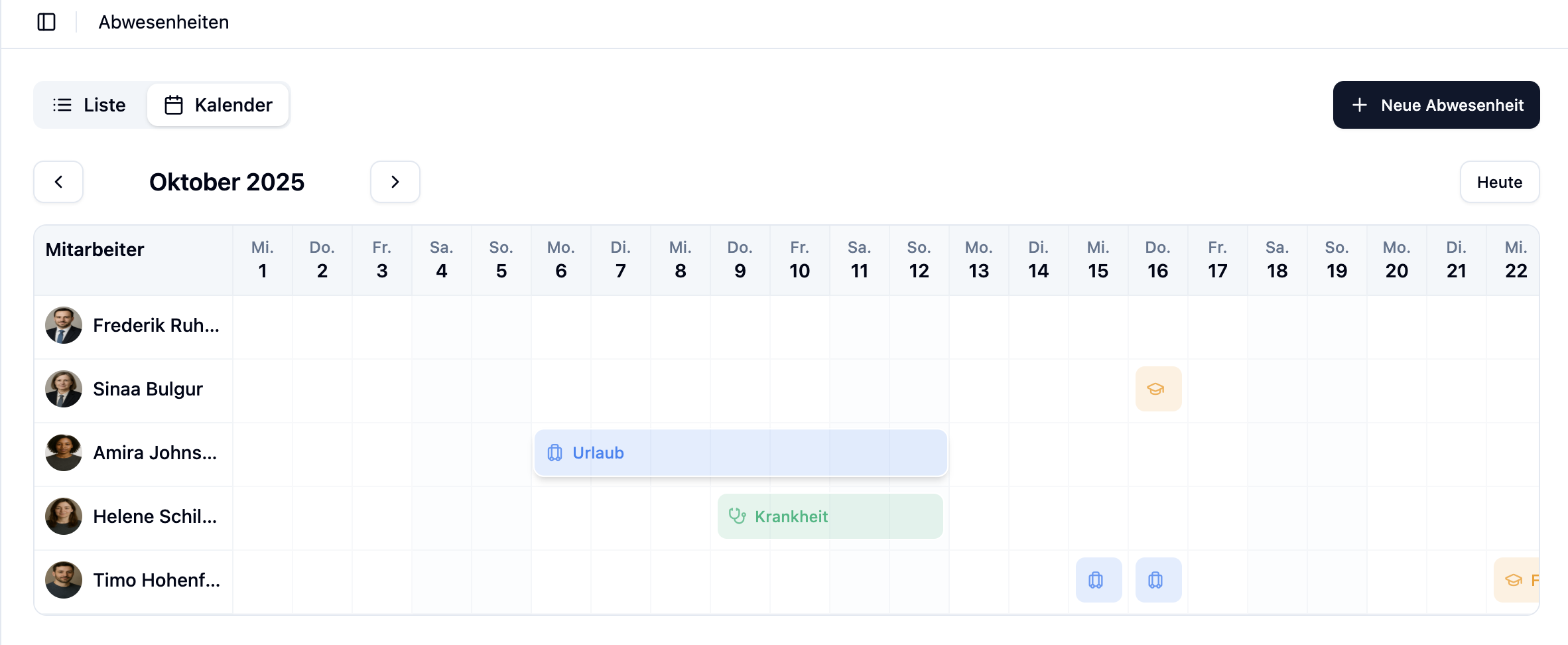 Mitarbeiter wiederum sehen ihr Urlaubskonto direkt im Dashboard, beantragen Abwesenheiten mit wenigen Klicks und behalten den Überblick über genehmigte und noch ausstehende Anträge. Das macht die Arbeitsrecht Urlaubsplanung im Voraus transparent, nachvollziehbar und rechtssicher — genau so, wie es das Bundesurlaubsgesetz vorsieht.